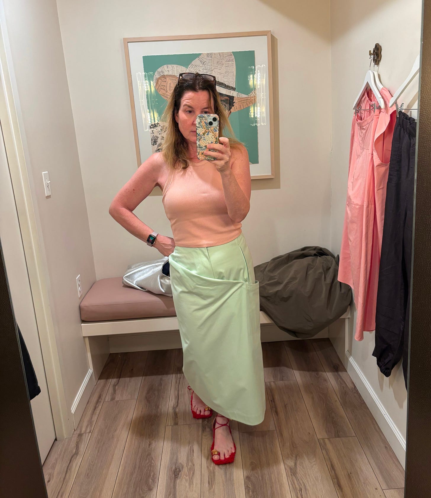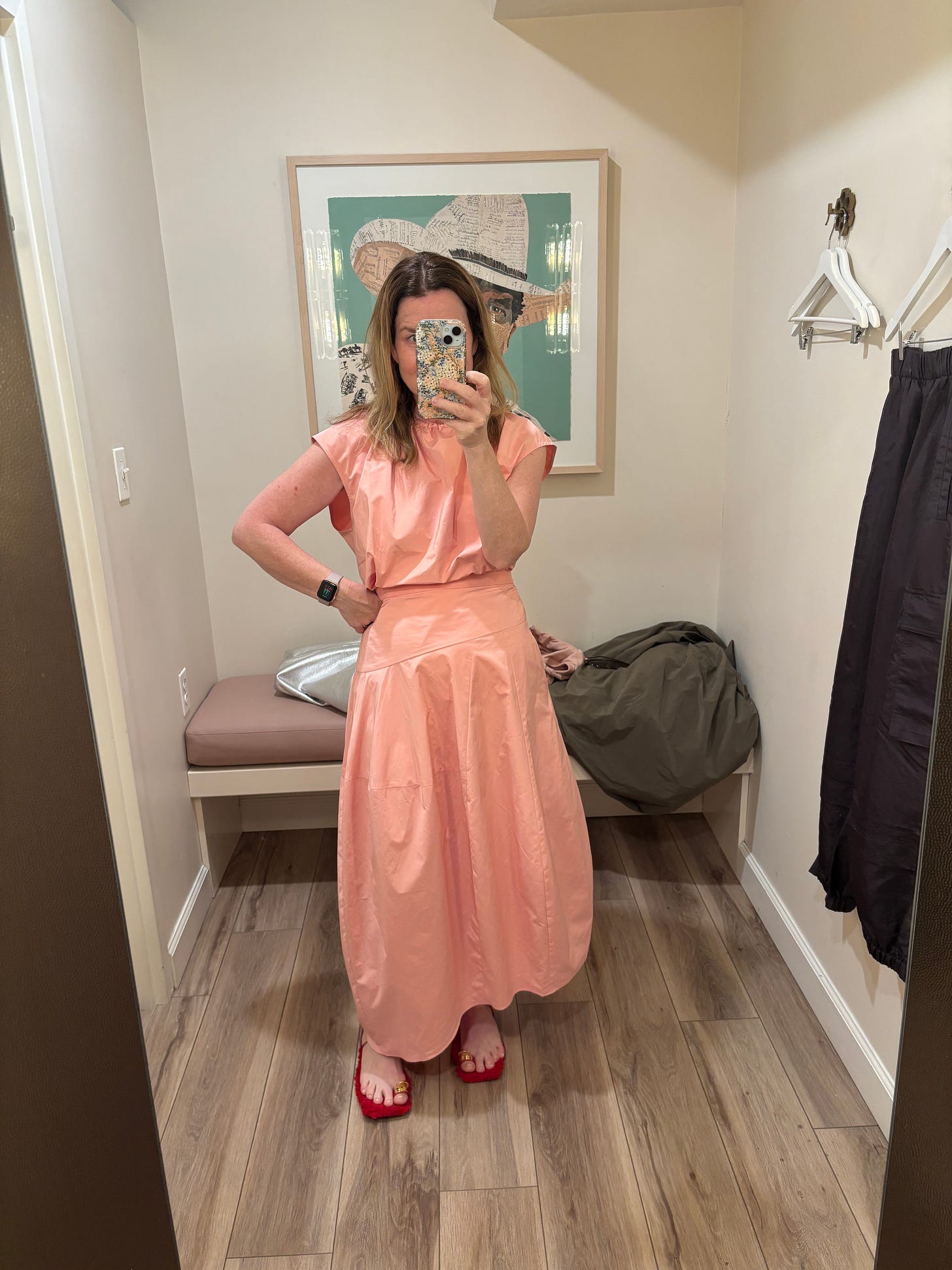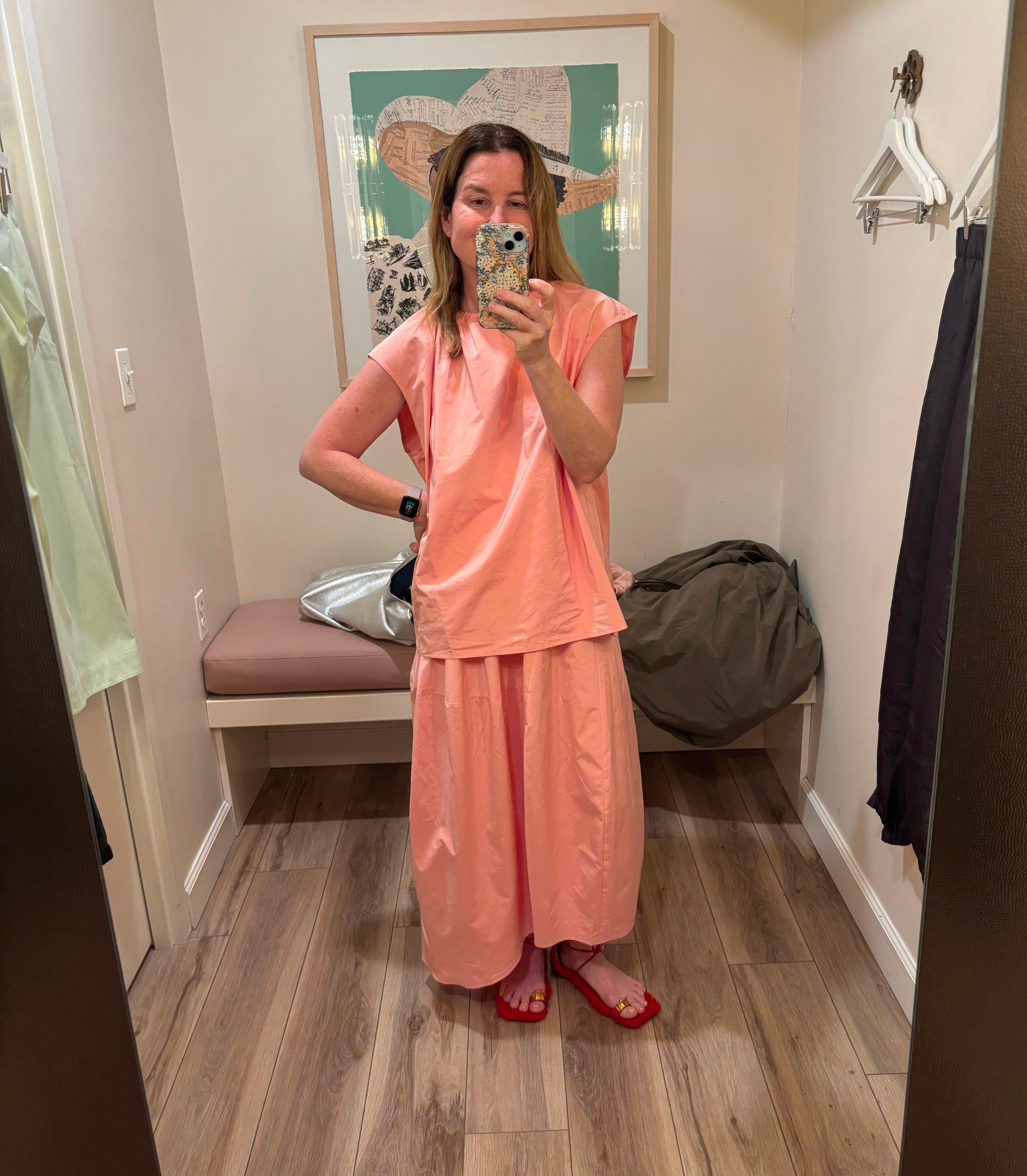 The skirt comes in two lengths and I prefer the longer length even though I am 5’4. I’m trying on a size large top in the picture because it’s all they had and I would order a small. After mulling it over, I think I might pass on the pink in favor of the ochre with fingers crossed that I can pull off the color. I have a lot of pink in my wardrobe and I think the ochre is more interesting. I also like the pink and ochre together so, God help us, it’s possible I need both.